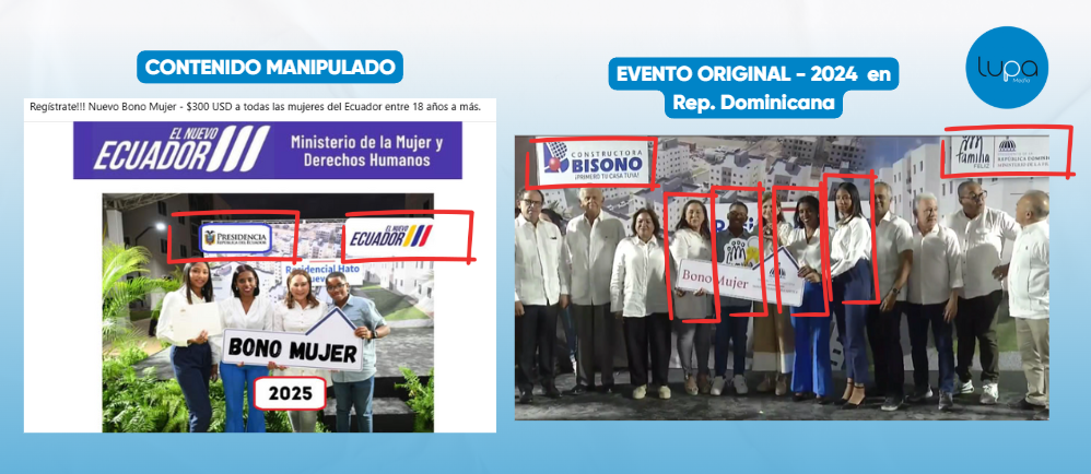 - La imagen utilizada en la campaña fraudulenta fue manipulada: proviene de un evento de entrega de viviendas en República Dominicana (marzo 2024) con logos de la presidencia ecuatoriana sobrepuestos
