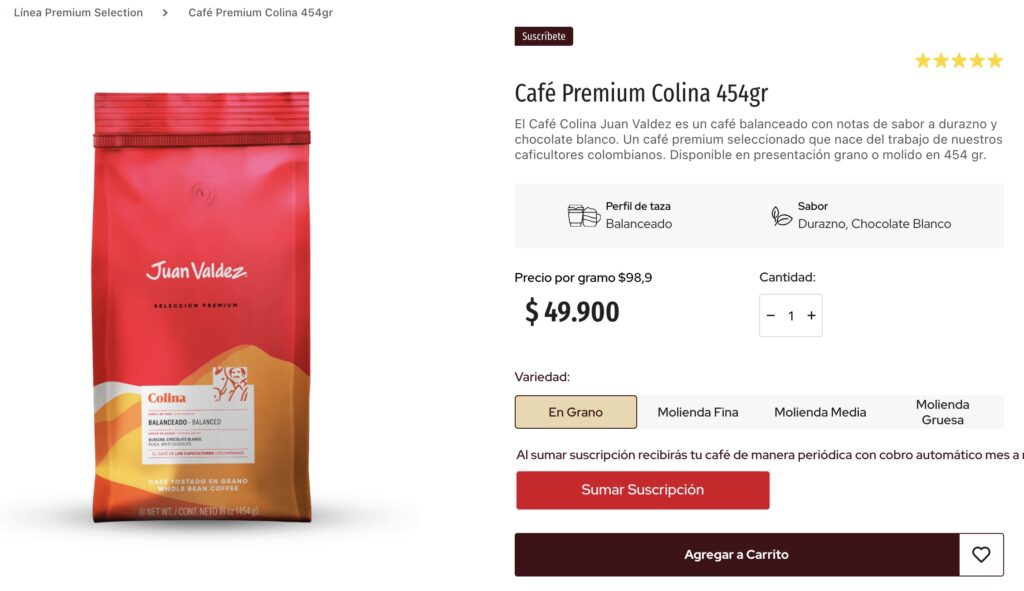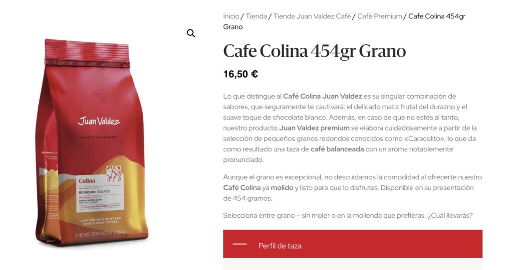 - En Ecuador, el café tostado y molido Colina de Juan Valdez se comercializa en distintas presentaciones. En supermercados como Supermaxi: