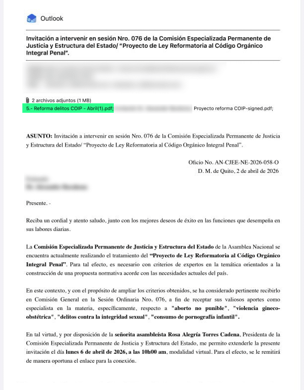 - Dos personas que comparecieron ante la Comisión de Justicia el 6 de abril de 2026, para aportar observaciones sobre los artículos referidos a violencia obstétrica en las reformas al COIP, confirmaron que el apartado sobre “violencia digital” formaba parte de un documento de trabajo que la propia comisión les entregó como insumo para la consulta.