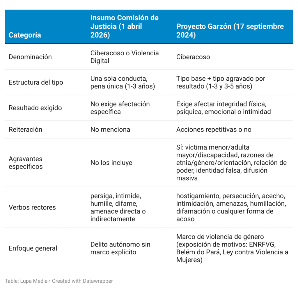 - Denominación: el insumo de la Comisión de Justicia habla de “ciberacoso o violencia digital”; el proyecto de Garzón, de “ciberacoso”.