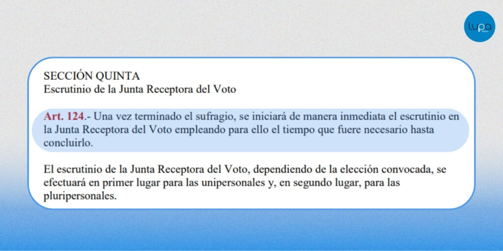 - El artículo 124 del Código de la Democracia establece que, una vez terminado el sufragio, el escrutinio en la Junta Receptora del Voto debe iniciarse de forma inmediata.