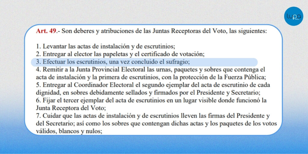 - El artículo 49 del mismo código señala que efectuar los escrutinios es un deber expreso de las Juntas Receptoras del Voto una vez concluida la votación.