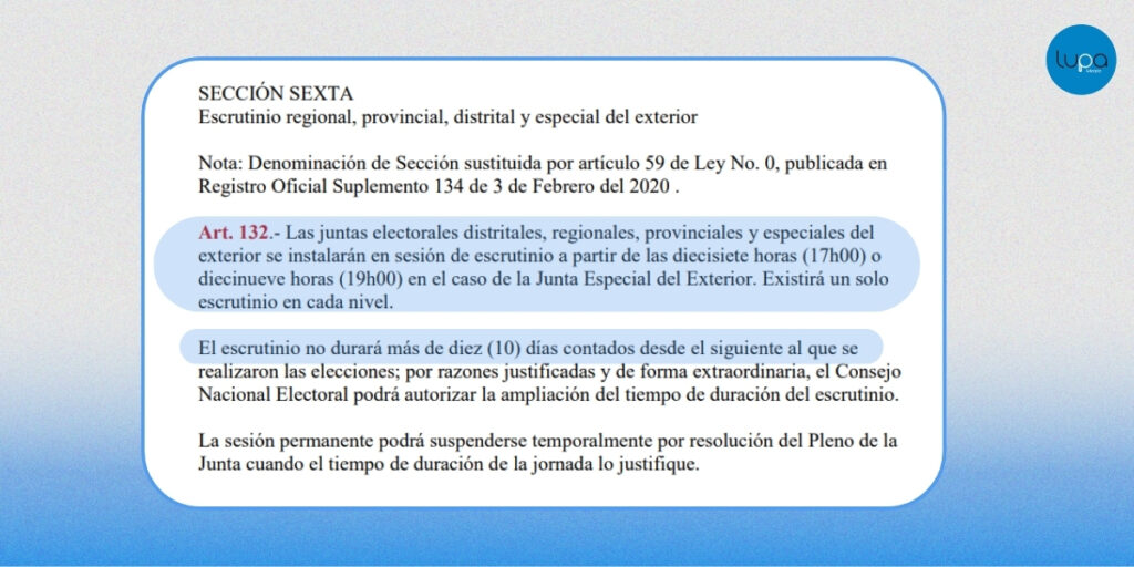 Es falso que entre el 2 de enero y el 13 de febrero se realice el conteo de votos. Lo cierto es que esas fechas sí aparecen en el calendario electoral, pero corresponden a la resolución de recursos y proclamación de resultados. El escrutinio —es decir, el conteo inicial de votos— ocurre el 29 de noviembre, mismo día de la votación como establece el Código de la Democracia.