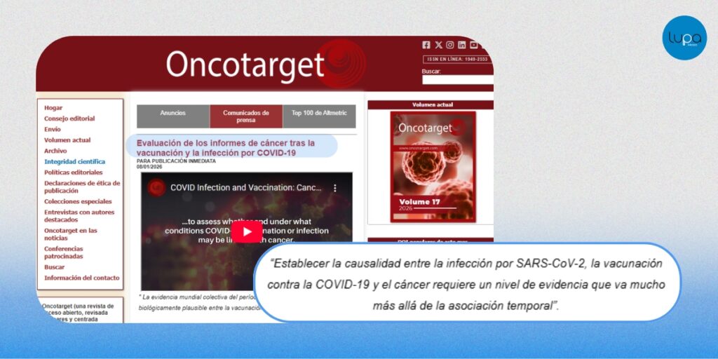 • El estudio existe, pero es una revisión exploratoria: El 3 de enero de 2026, la revista Oncotarget publicó una revisión titulada “Evaluación de los informes de cáncer tras la vacunación y la infección por COVID-19”. El trabajo analiza reportes publicados entre 2020 y 2025.