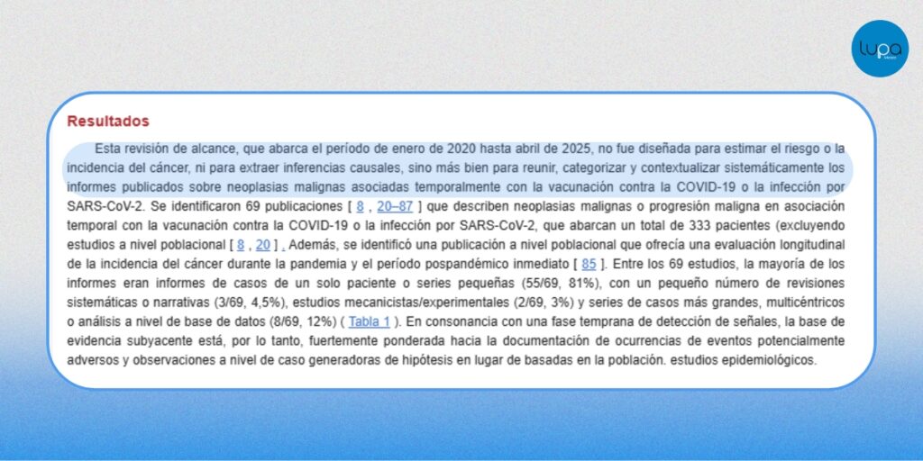 La afirmación se basa en un hecho real —el estudio existe y revisa reportes—, pero omite información clave: la investigación no establece ni confirma una relación causal entre la vacunación contra la COVID-19 y el cáncer. Al excluir este contexto, la publicación induce a una interpretación que el estudio no respalda.