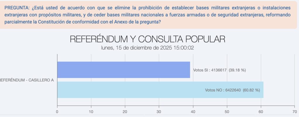 Un antecedente cercano es la consulta popular de 2025, que incluyó una pregunta sobre cooperación internacional en materia de seguridad, específicamente sobre la instalación de bases militares extranjeras. En ese caso, la mayoría de votantes se pronunció en contra: 60,82% votó “No” —alrededor de 6,4 millones de personas—, frente a un 39,18% que apoyó la medida.