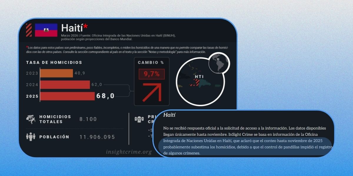 • Además, Insight Crime señaló que no obtuvo respuesta oficial del gobierno haitiano y que los datos disponibles son preliminares e incompletos.