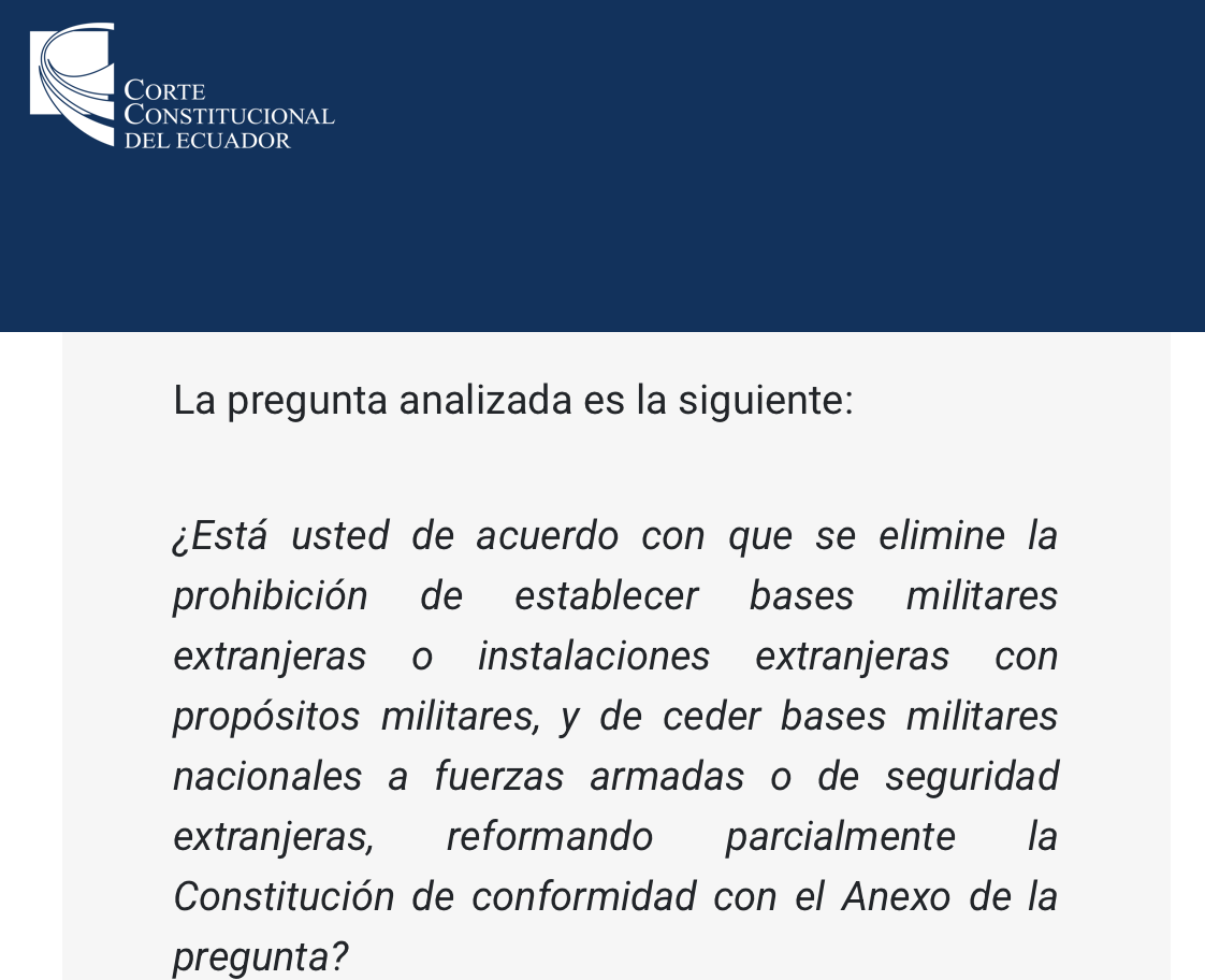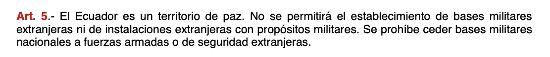 - La Constitución ecuatoriana, prohíbe el establecimiento de bases militares extranjeras en el país (artículo 5). Para que esta prohibición pueda cambiarse, la ciudadanía deberá pronunciarse en las urnas en un referéndum.
