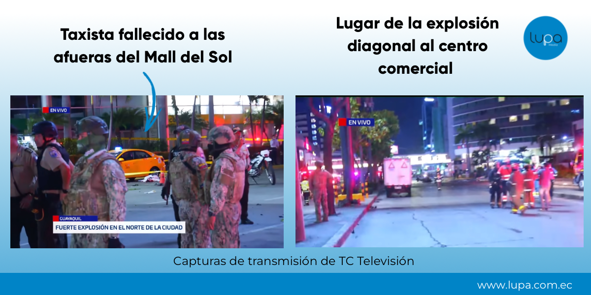 - Ubicación del suceso: En la transmisión de TC Televisión se observa que el taxi de Benítez quedó cerca del cuerpo, a las afueras del Mall del Sol, diagonal al Hotel Sheraton, lugar del estallido. Núñez, en cambio, estaba grabando desde otro punto y no fue alcanzado directamente.