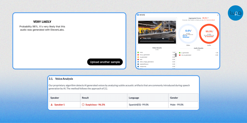 - ElevenLabs: 98% de probabilidad de audio generado o clonado con IA.