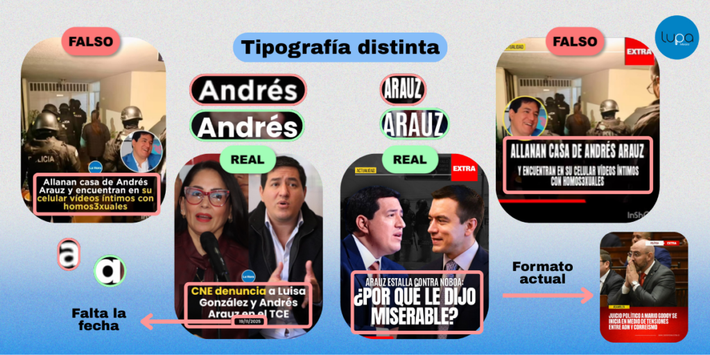 Diario Extra, Primicias, Diario La Hora y Metro Ecuador confirmaron a Lupa Media que esas portadas no son de su autoría. No hay evidencia de comunicados de la Fiscalía, ni reportes periodísticos que mencionen contenido sexual hallado en un celular de Arauz. Además, las imágenes presentan errores en tipografías, formatos antiguos y uso incorrecto del estilo visual de los medios suplantados.