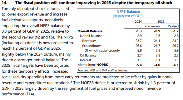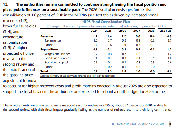 - El informe del FMI indica que un alza del precio del petróleo mejoraría los ingresos del Estado y facilitaría las metas fiscales. Solo menciona la reducción gradual de subsidios a gasolina y diésel y la nueva fórmula de precios de la gasolina aprobada en agosto de 2025, además de ajustes en tarifas eléctricas industriales y mineras.