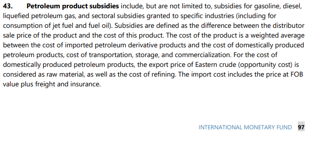- El FMI menciona el GLP solo en la sección técnica de definiciones, donde lo incluye dentro de los “subsidios a productos petroleros” junto con gasolina y diésel, solo con fines contables para medir el gasto fiscal. Esta es una clasificación estándar, no una recomendación para eliminar subsidios.