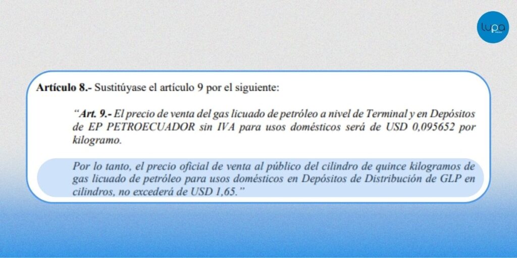 - El Decreto Ejecutivo N.º 215 establece que el precio del cilindro de 15 kg para uso doméstico no supera USD 1,65, valor que no ha sido modificado.
