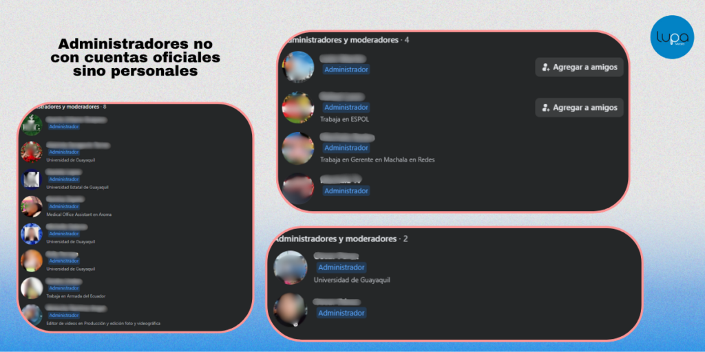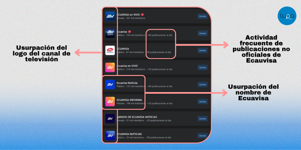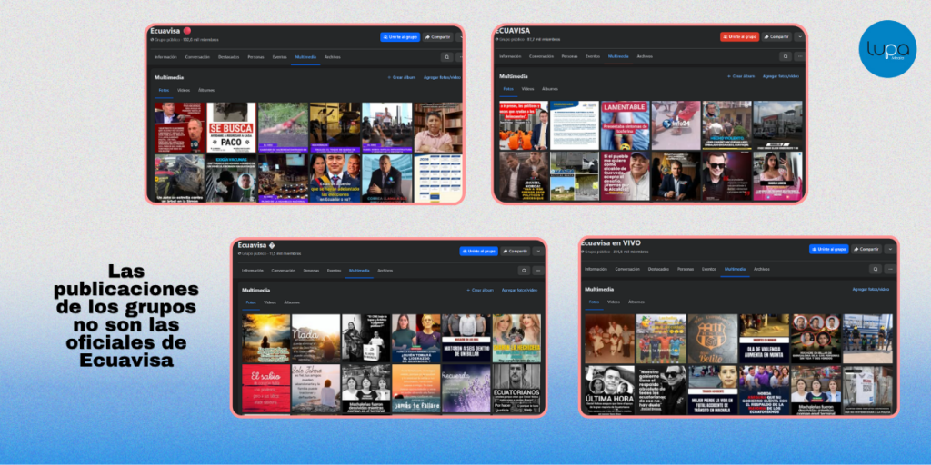 Ecuavisa confirmó a Lupa Media que no administra ni opera grupos en Facebook, su único canal de difusión directa en esa plataforma es un canal de Messenger. Los grupos que circulan con su nombre son creados y administrados por usuarios particulares sin vínculo con el medio, y publican contenido que no corresponde a su línea editorial.