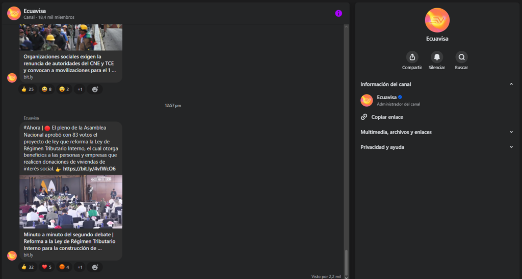 • Ecuavisa confirmó a Lupa Media que no administra ni opera grupos en Facebook. Su único canal de difusión directa en esa plataforma es un canal de Messenger con 18.4 mil miembros.