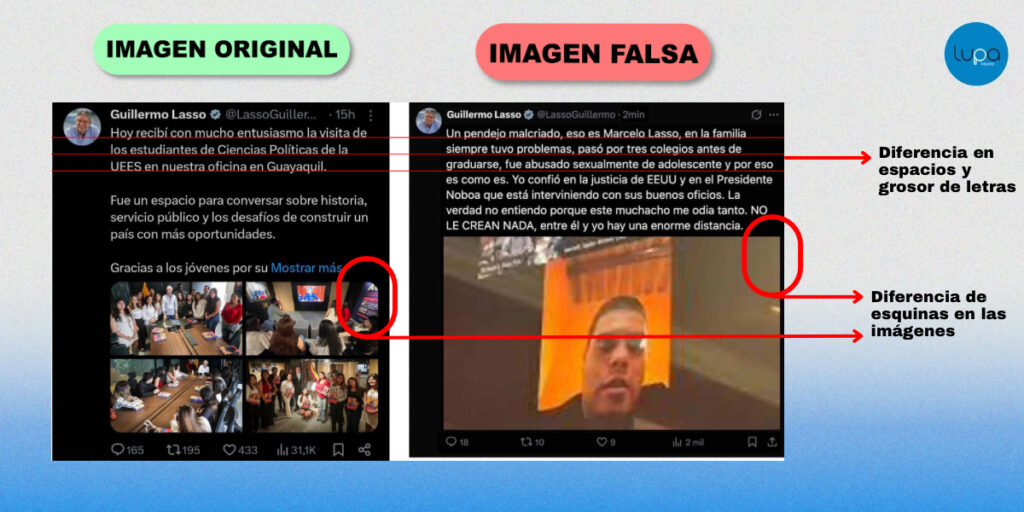 COMPLETAMENTE FALSO: No existe evidencia de que Guillermo Lasso haya publicado el tuit atribuido, no aparece en su cuenta oficial, tampoco tiene huella digital o registro en archivos web. El equipo del expresidente confirmó a Lupa Media que el contenido es falso y que no existe algún vínculo personal o familiar con Marcelo Lasso. Además, el contenido posee inconsistencias gráficas que evidencian que se trata de un contenido fabricado.