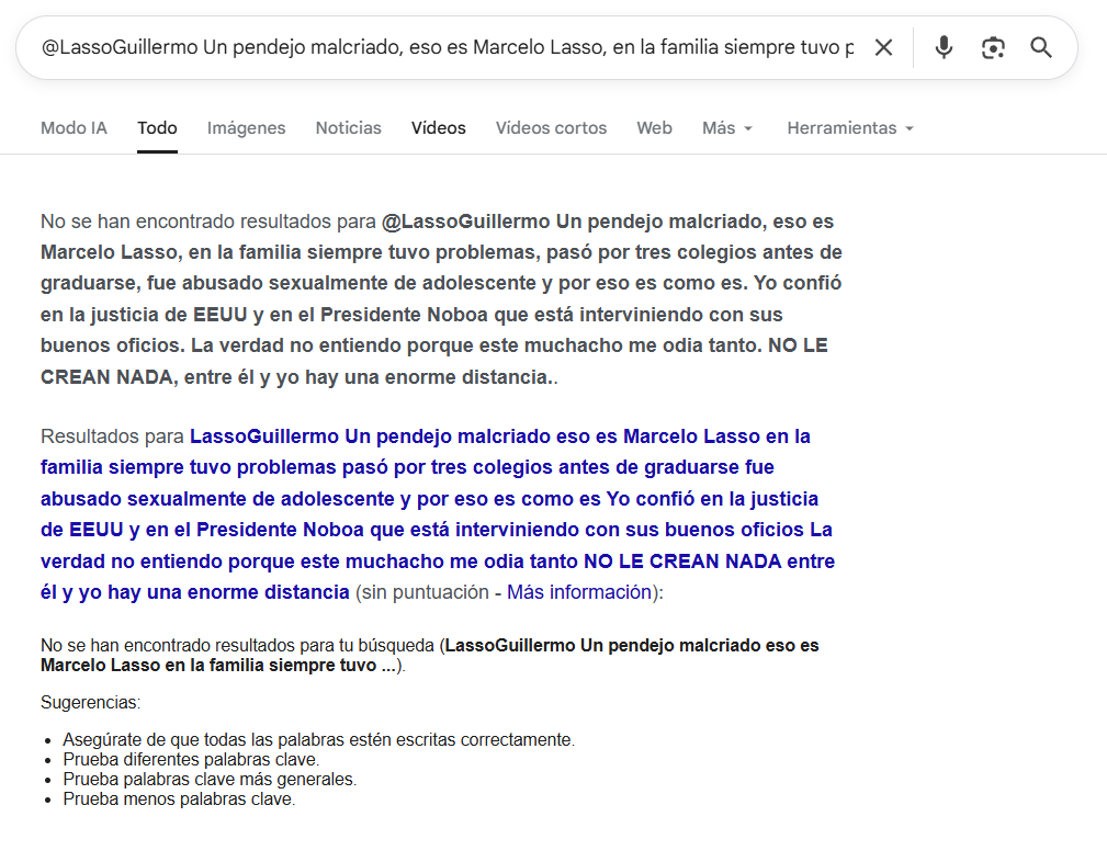 Porque no existe evidencia digital, documental ni testimonial que respalde la existencia del tuit. Incluso el propio equipo de Guillermo Lasso negó su autoría y cualquier tipo de relación personal o familiar con Marcelo Lasso. El contenido que circula corresponde a una fabricación, más no a una publicación real.