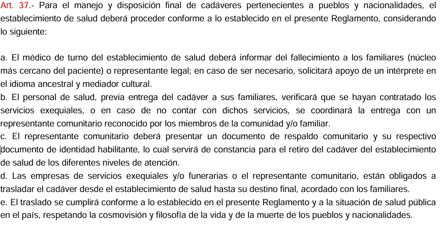 - Para pueblos y nacionalidades indígenas: el reglamento especifica que el manejo del cadáver debe respetar su cosmovisión y prácticas culturales. Las autoridades de salud deben informar a la familia en su idioma, verificar la disponibilidad de servicios funerarios o coordinar con un representante comunitario, quien debe presentar documentos para retirar el cuerpo. El traslado al destino final debe cumplir con condiciones de salud pública y dignidad humana.