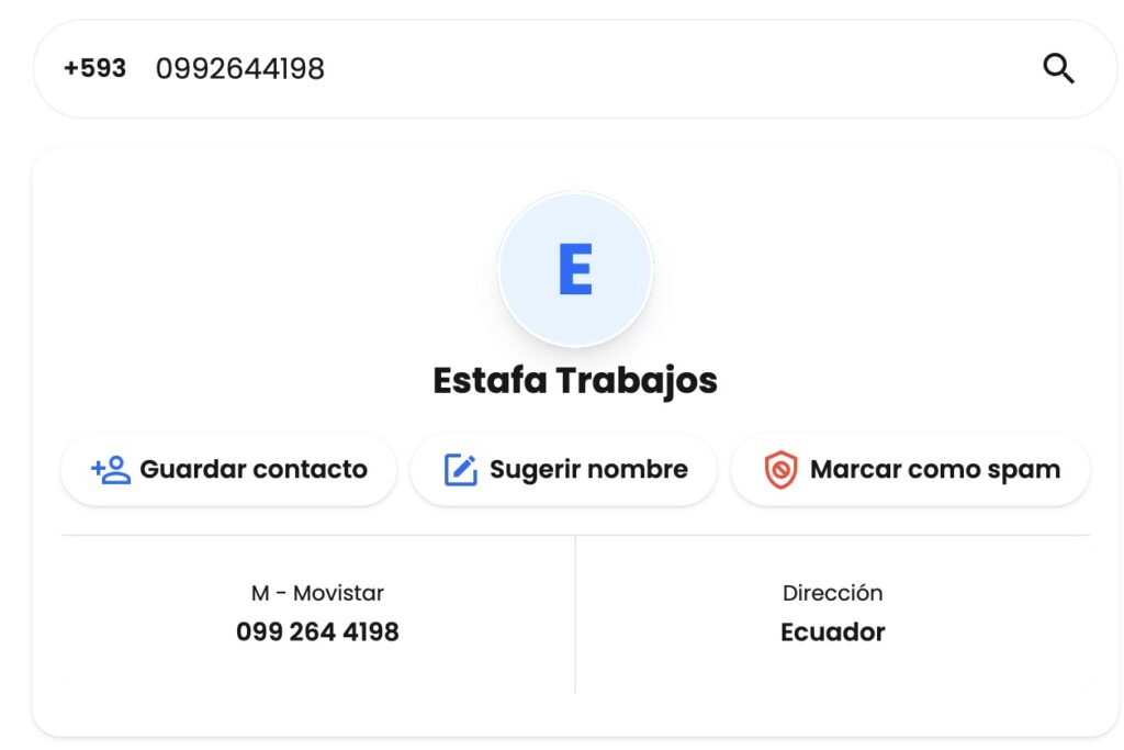 - Al rastrear el teléfono en la aplicación True Caller, se identifica que el número está denominado como «Estafa Trabajos». Un indicio que señala ese número telefónico es utilizado frecuentemente para este tipo de estafas.