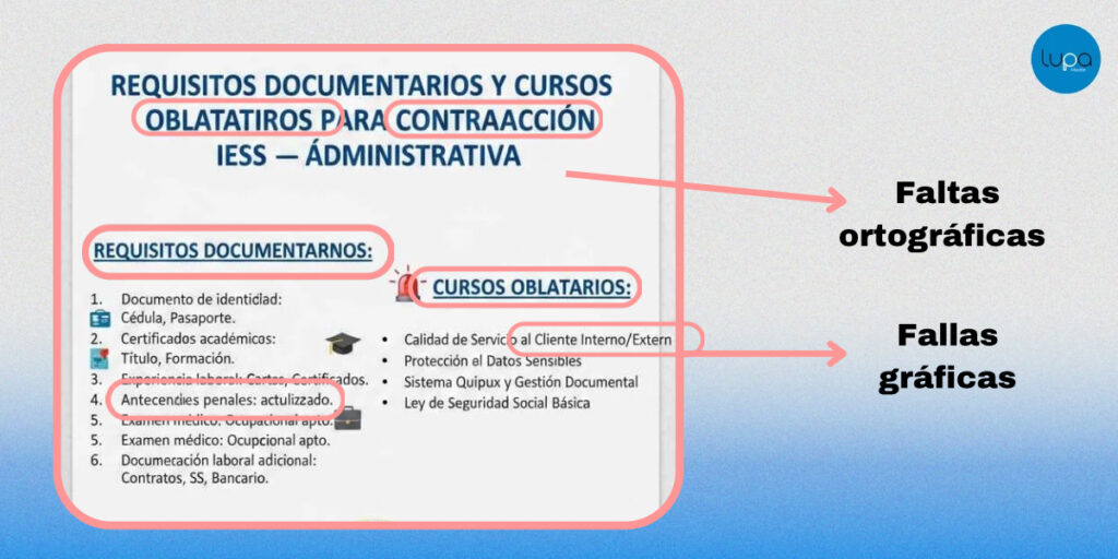 - Contiene faltas ortográficas como “cursos oblatatiros”, “para contraacción” y “ádministrativa”, «requisitos documentarnos«, «antecendes penales«, «actulizzado«, «documecación laboral«, entre otros más.