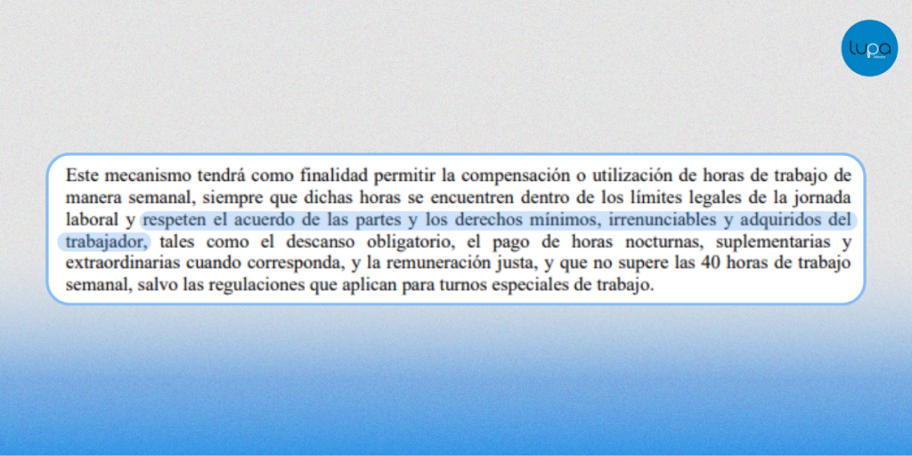 • Las horas extras y el descanso obligatorio siguen vigentes, y este esquema debe aplicarse mediante acuerdo entre trabajador y empleador.