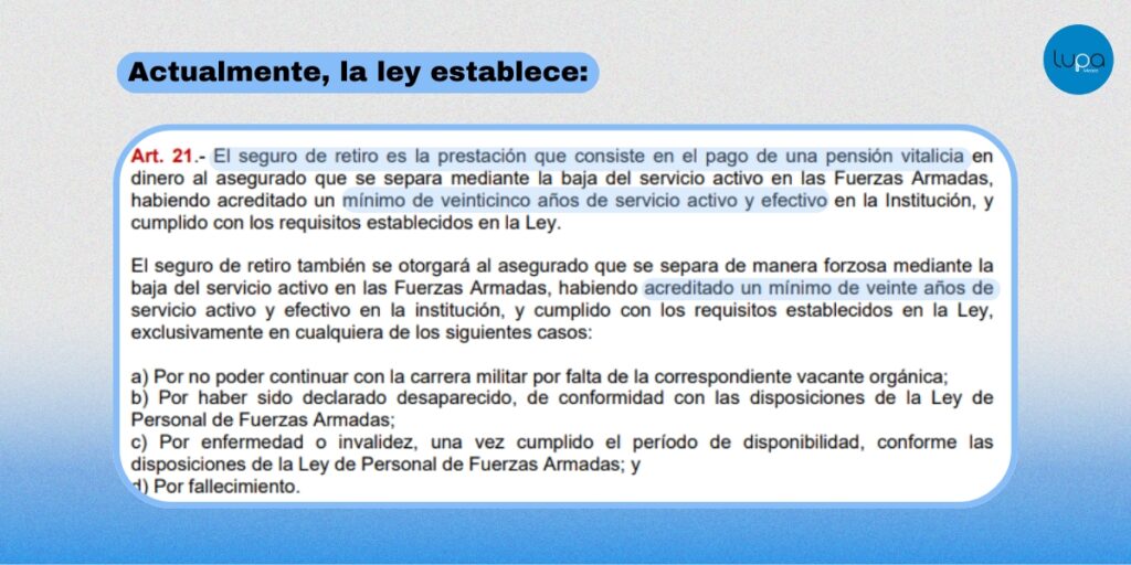 - El Consejo Directivo del ISSFA propuso cambios que incluyen aumentar los años de servicio requeridos para el retiro de 20 a 25 años para salida forzosa o por terminación de carrera y a 26 años para salida voluntaria. La justificación técnica se basa en la necesidad de financiamiento debido al aumento de la esperanza de vida, lo que genera pensiones pagadas por más de 40 años.