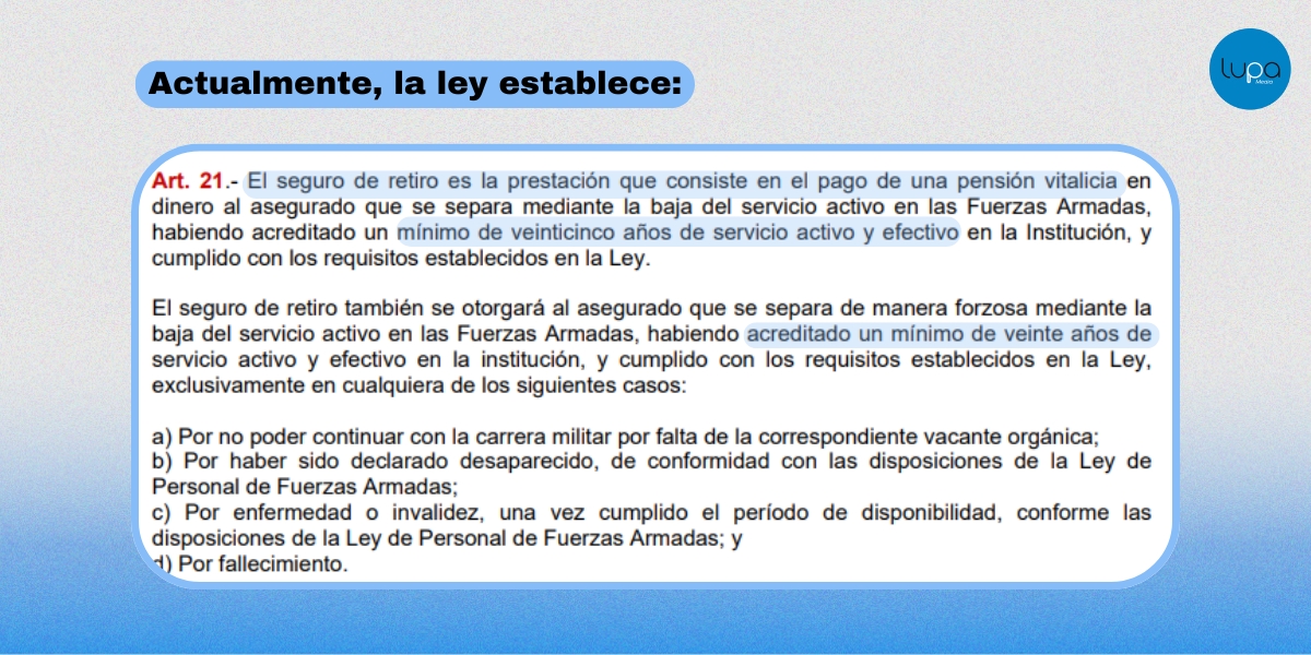 Actualmente, la pensión de retiro se otorga al militar que acredita un mínimo de 20 años de tiempo de servicio activo y efectivo o 240 aportaciones. La pensión se concede a partir del día siguiente a la fecha de baja publicada en la orden general correspondiente.