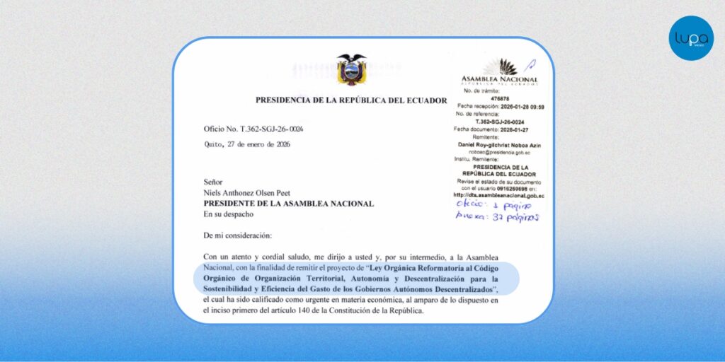 El presidente Daniel Noboa envió el 28 de enero a la Asamblea Nacional un proyecto de ley económica calificado como urgente, con un plazo de tratamiento de 30 días. La propuesta reformatoria al COOTAD regula la asignación del presupuesto de los Gobiernos Autónomos Descentralizados (GADs), pero no prohíbe conciertos ni eventos culturales.
