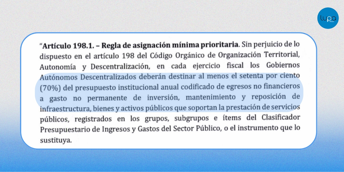 • La reforma establece que los GADs —municipios, prefecturas y juntas parroquiales— deberán destinar al menos el 70% de su presupuesto institucional anual a: