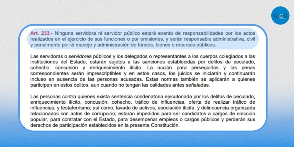- El artículo 233 aclara que ningún servidor público está exento de responsabilidad por actos u omisiones en el ejercicio de sus funciones.