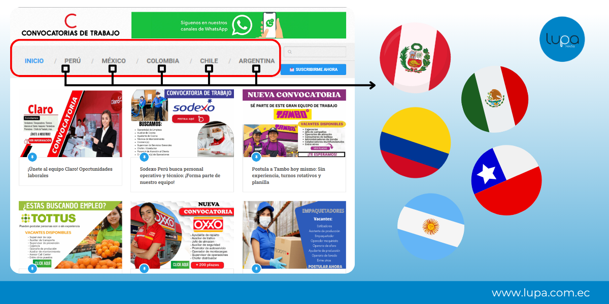 - El enlace viral redirige a un sitio web “Convocatorias de Trabajo” que muestra ofertas laborales falsas de varios países latinoamericanos, no solo de Ecuador.