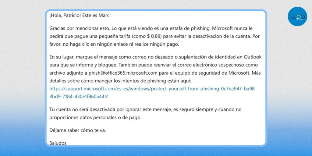 Porque Microsoft no suspende cuentas por falta de pago ni envía correos exigiendo renovar el servicio por 0,89 dólares. El mensaje analizado no proviene de dominios oficiales y utiliza un enlace que redirige a un sitio que suplanta la identidad de Microsoft. Lo que confirma que se trata de una estafa de phishing diseñada para robar datos personales.