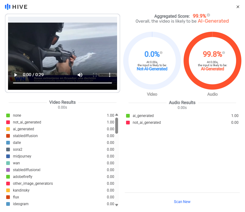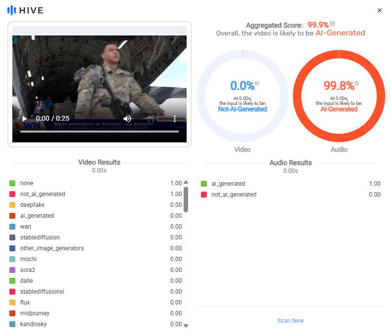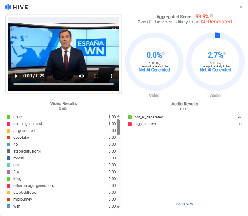 La herramienta para detectar IA, Hive Moderation, detectó un promedio de 99.9% de probabilidad de que el video viral de este supuesto noticiero esté hecho artificialmente.