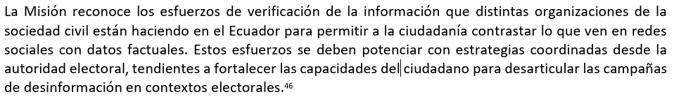 - No hay acusaciones, pruebas ni solicitudes de investigación dirigidas al Ejecutivo. La recomendación es una práctica estándar de la MOE/OEA en todos los procesos electorales que observa, destinada a cualquier posible caso, sin importar el actor político involucrado.
