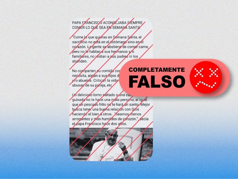 Una publicación viral atribuye al difunto papa Francisco la frase: "Coman lo que quieran en Semana Santa. El sacrificio no está en el estómago, sino en el corazón", pero no existe ningún registro oficial del Vaticano ni evidencia de que la haya pronunciado.