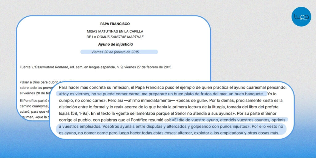 La desinformación sobre prácticas religiosas suele resurgir en épocas litúrgicas clave. Esta cita falsa circula de forma recurrente cada año durante la Cuaresma y la Semana Santa, período en que el ayuno y la abstinencia cobran relevancia para los católicos.