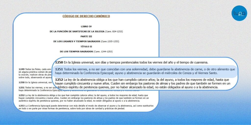 • El Código de Derecho Canónico (c. 1249-1253) establece que todos los bautizados deben abstenerse de comer carne todos los viernes del año, excepto cuando coincidan con una solemnidad. Además, se debe guardar ayuno y abstinencia el miércoles de Ceniza y el Viernes Santo.