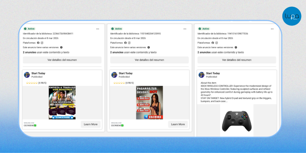 - La cuenta que publica el video tiene al menos seis anuncios activos en Instagram y Facebook, todos promocionando distintas plataformas de inversión.