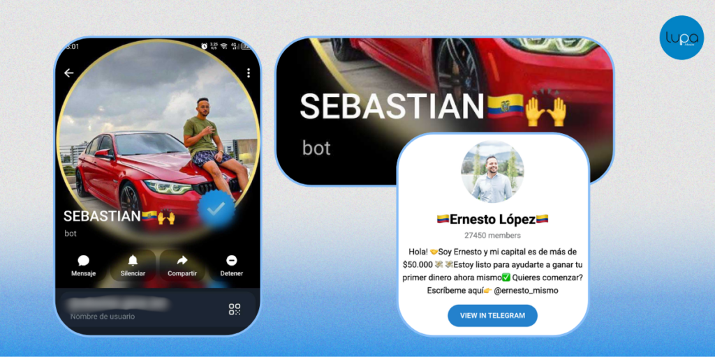 - Los anuncios redirigen a usuarios de Telegram identificados como bots o vinculados a ofertas similares, con los nombres de “Sebastián” y “Ernesto Lopez”.