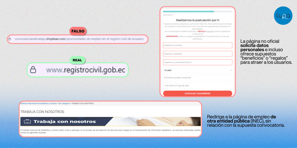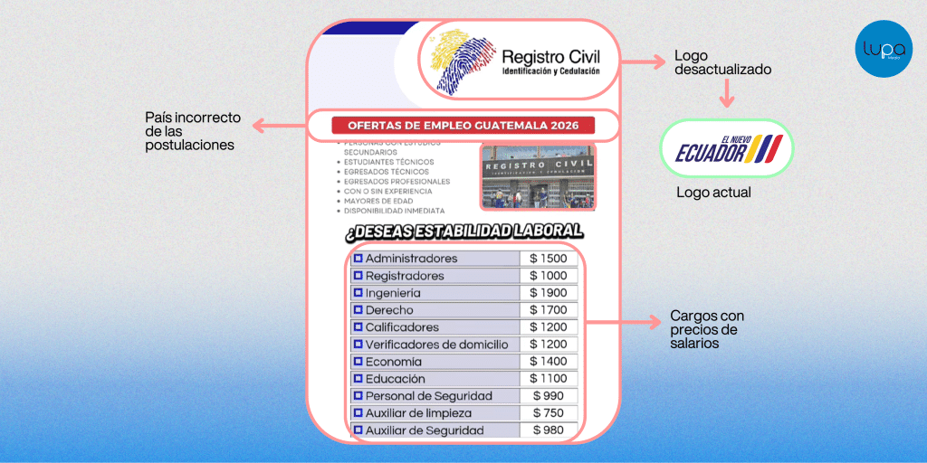 No existe ninguna convocatoria de empleo vigente del Registro Civil del Ecuador. La propia institución confirmó a Lupa Media que no utiliza redes sociales ni enlaces externos para difundir vacantes ni solicitar información personal. El contenido presenta múltiples señales de engaño: ofrece cargos con precios, dirige a dominios no oficiales y contiene inconsistencias que contradicen su supuesto origen institucional.