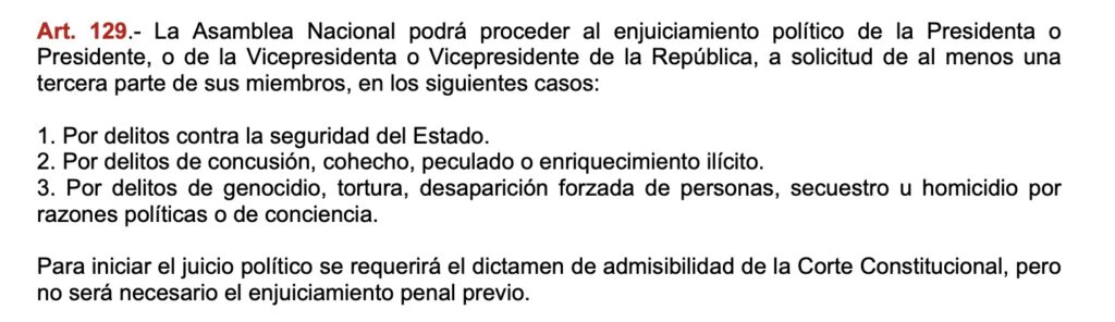 - Causal para destitución: El artículo 129 de la Constitución del Ecuador establece tres causales para iniciar un juicio político contra el presidente: