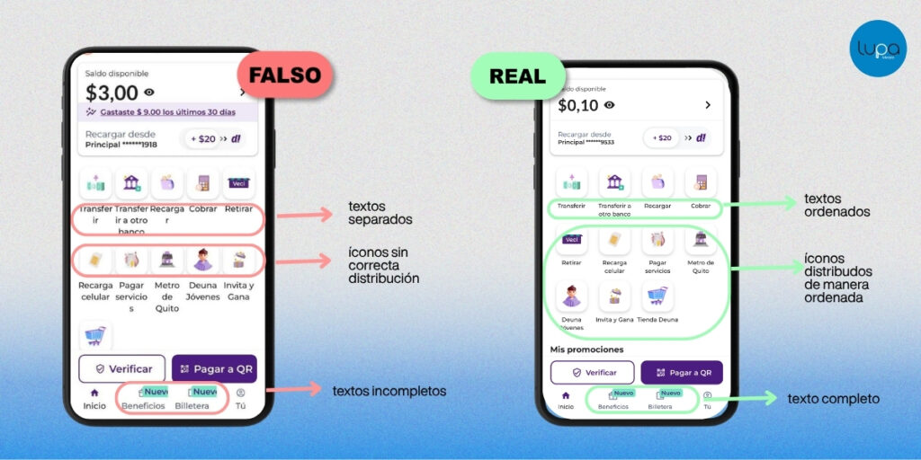- Los comprobantes de pago compartidos en el grupo incluyen una captura de pantalla de la aplicación De Una con inconsistencias visuales: nombres de funciones recortados y elementos desalineados, lo que indica que son falsificaciones.