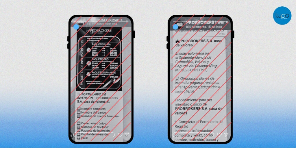 - Un grupo de Telegram llamado «Probrokers Inversión» usa ilegalmente la identidad de Probrokers S.A., casa de valores autorizada en Ecuador, para captar dinero mediante estafa.