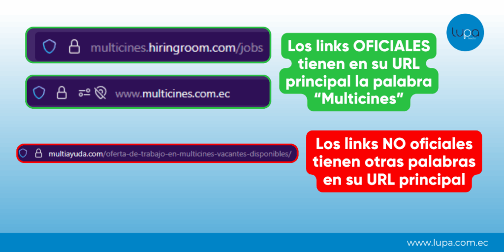 Multicines confirmó a Lupa Media que esa página no pertenece a la empresa ni gestiona procesos de contratación. Los portales oficiales incluyen siempre la palabra multicines en su dirección web.