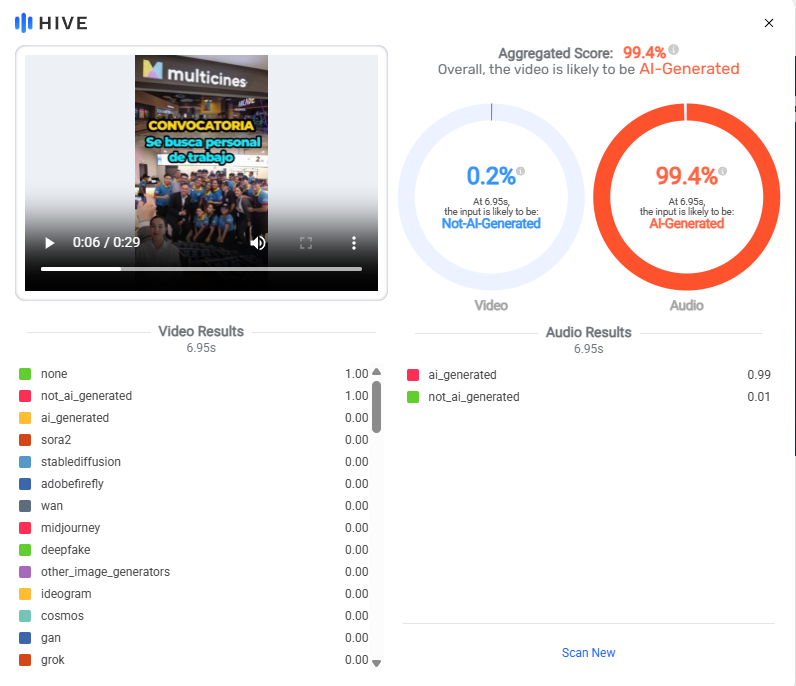 - La herramienta Hive Moderation determinó un 99,4% de probabilidad de que el video fue generado con inteligencia artificial, lo que indica que la voz e imagen de la mujer son sintéticas.