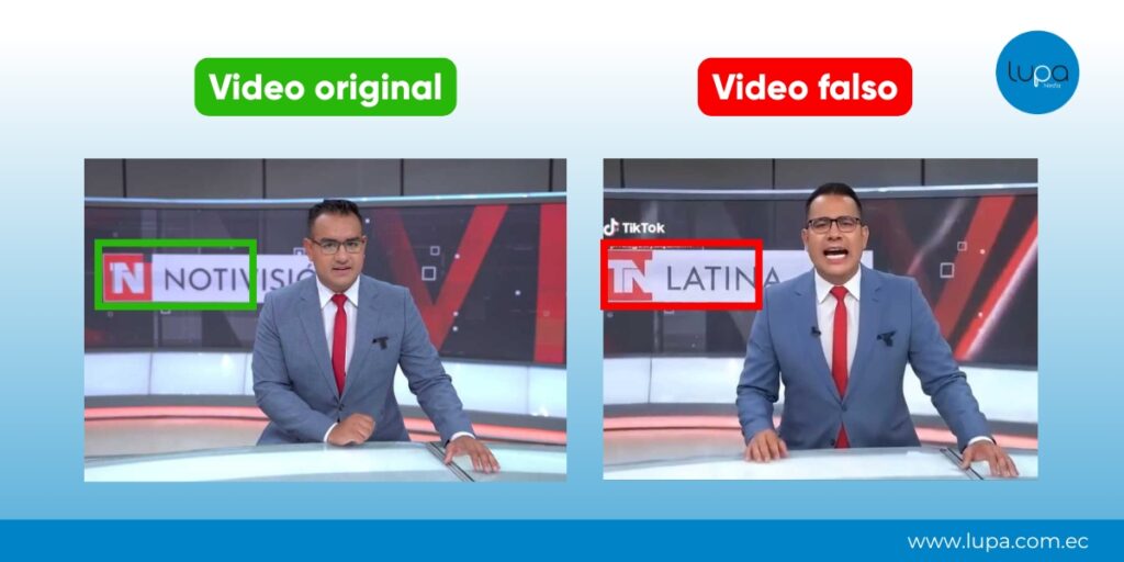 • En el video original, el logotipo de fondo corresponde a Notivisión, mientras que en el video manipulado se reemplaza por el de Telenoticiero (República Dominicana).