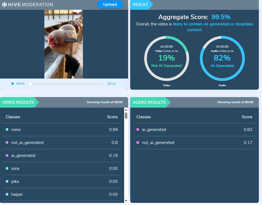 • Análisis digital: Lupa Media analizó el contenido con Hive Moderation, herramienta de detección de IA, que arrojó una probabilidad del 99,5 % de que el video haya sido creado artificialmente.