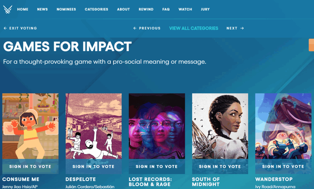 - También está nominado en «Games for Impact Award», categoría que reconoce videojuegos con mensaje social o cultural significativo.